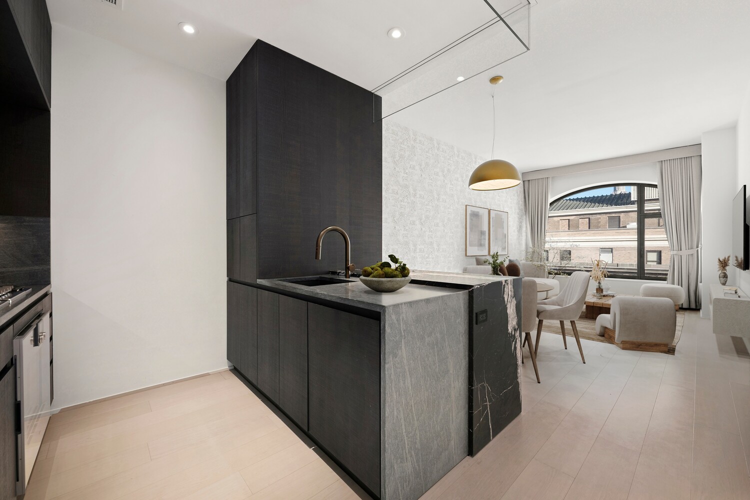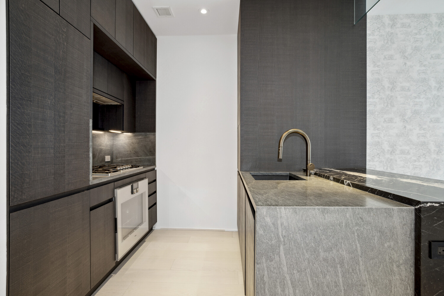 The open-concept kitchen is a chef's dream with Salvatori Pietra Cardosa marble countertops and backsplash. There's also custom Pedini Italian textured and blackened oak cabinetry along with high-end Bosch and Gaggenau appliances.