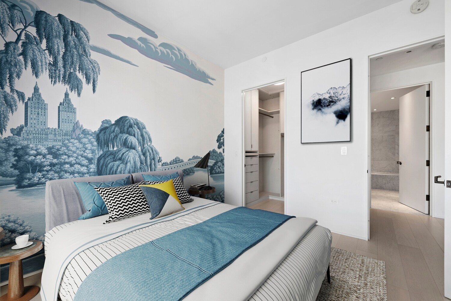 The attention to detail continues into the Italian Bianco Carrara marble bathroom with radiant-heated floors and a custom Pedini Italian millwork double sink vanity. There is a large walk-in closet at the entryway, a utility closet with the washer and dryer next to the bathroom and a large bedroom closet.
